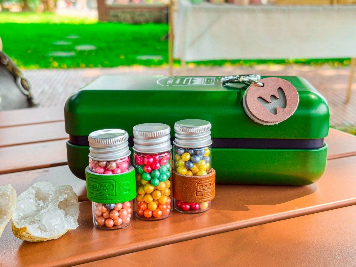 以多種甜食組合的時空糖膠囊禮盒,可以選擇大小不同的色調鐵盒,放入不同口味的甜食,